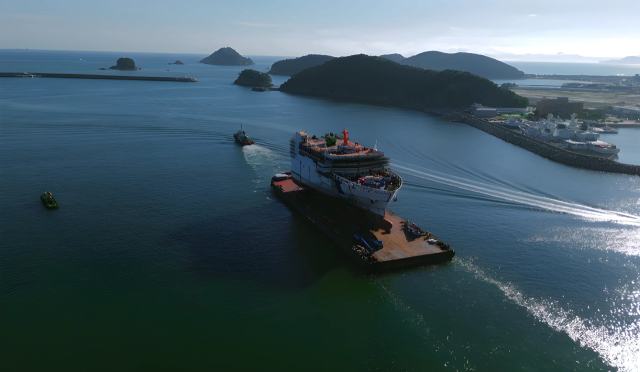 팬스타그룹이 국내 최초로 건조한 크루즈페리 ‘팬스타 미라클호’의 선수 블록(선체 일부)이 지난 12일 부산 다대조선소에서 영도조선소로 이동하고 있다. 팬스타그룹 제공
