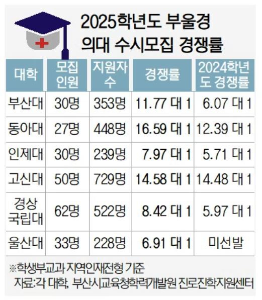 부산·울산·경남 의대 6곳도 모두 지난해보다 높은 경쟁률을 기록했다. 부울경 의대 6곳의 수시모집 경쟁률은(지난 13일 오후 6시 기준) 11.34 대 1로 집계됐다. 총 모집 정원 318명을 뽑는데 3605명이 몰렸다. 이는 지난해 경쟁률 9.70 대 1(총 191명 모집, 1852명 지원)을 웃도는 기록이다.