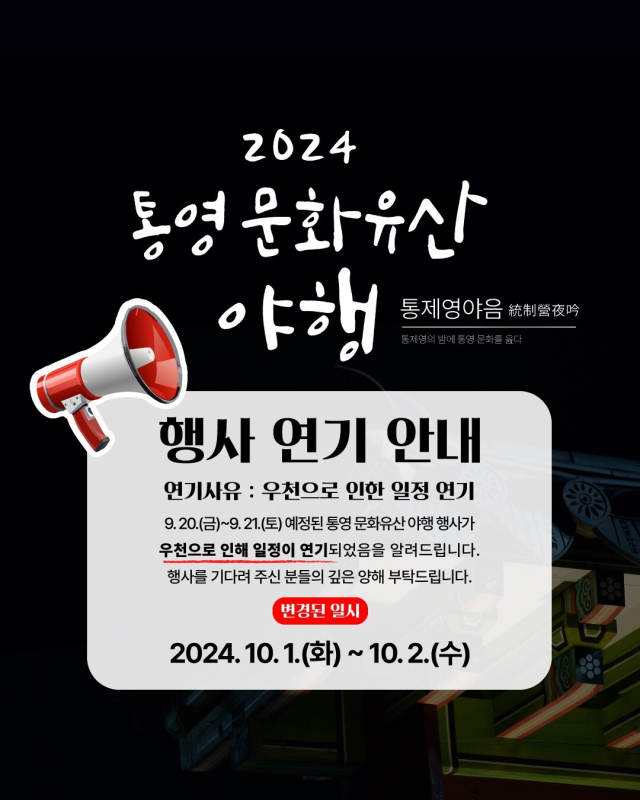 (재)통영한산대첩문화재단은 주말 사이 남해안 지역에 100mm 이상 폭우가 예상돼 ‘2024 통영 문화유산 야행’ 행사 일정을 20·21일에서 10월 1·2일로 변경했다고 19일 밝혔다.