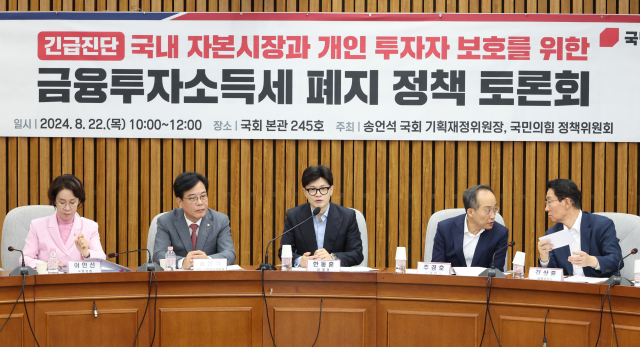 국민의힘 한동훈 대표(왼쪽 세번째)가 지난 8월 22일 오전 국회에서 열린 '국내 자본시장과 개인 투자자 보호를 위한 금융투자소득세 폐지 정책 간담회'에서 발언하고 있다. 연합뉴스