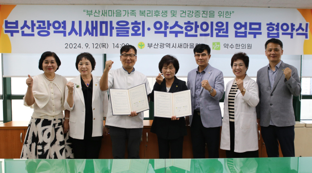 부산시새마을회(회장 백옥자·왼쪽에서 네 번째)는 최근 부산시새마을회관 9층 회의실에서 약수한의원(원장 김동관·왼쪽에서 세 번째)과 업무 협약식을 체결했다. 부산시새마을회 제공