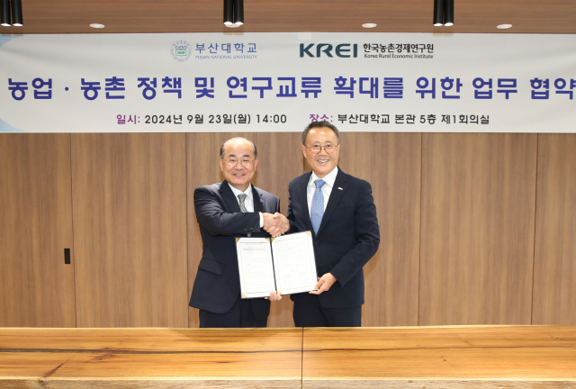 부산대학교(총장 최재원·왼쪽)는 23일 대학본부 5층 제1회의실에서 한국농촌경제연구원(원장 한두봉·오른쪽)과 농업·농촌 정책 및 연구 교류 확대를 위한 업무협약을 체결했다. 부산대 제공