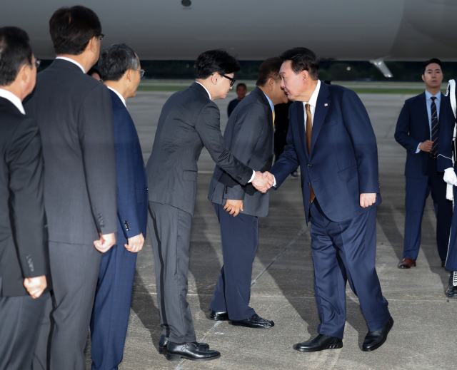 윤석열 대통령이 22일 성남 서울공항에서 체코 공식 방문을 마치고 귀국하며 마중 나온 국민의힘 한동훈 대표와 악수하고 있다. 연합뉴스