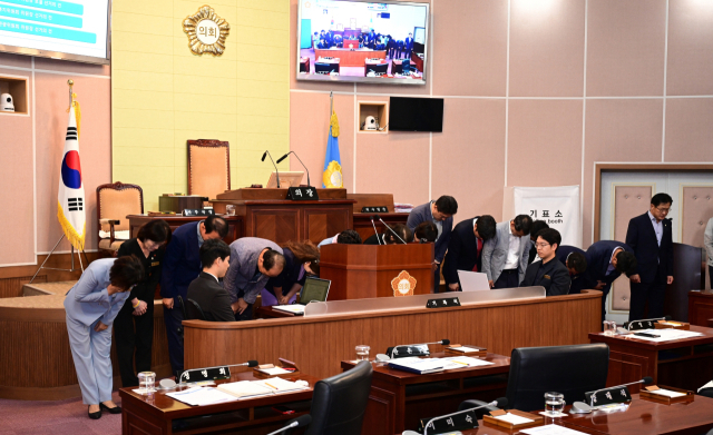 지난 4일 오후 제248회 임시회 제6차 본회의에서 후반기 원 구성을 마무리한 거제시의원들은 전원 단상 앞으로 나와 머리를 숙이고 그간의 파행 사태에 대해 사과했다. 부산일보DB