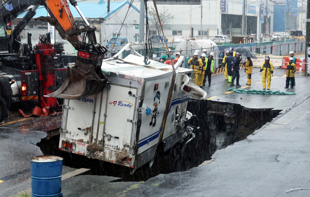 부산 도시철도 사상~하단선(6.9㎞) 공사 현장에서 지반 침하가 잦더니 급기야 초대형 땅꺼짐 현상(싱크홀)이 발생했다. 14호 태풍 ‘풀라산’이 온대 저기압으로 바뀌며 생성된 폭우가 엄습한 21일 오전 사상구의 도시철도 공사장 도로에 거대한 구멍이 뚫렸다. 크기가 가로 10m, 세로 5m, 깊이 8m에 달하는 엄청난 땅구멍이 생긴 것이다. 배수 작업 중이던 부산소방본부 차량과 5t 트럭이 순식간에 땅 밑으로 빨려 들어가는 광경에 운전자와 주민들은 충격과 공포를 느꼈다. 문제는 사상~하단선 구간의 땅꺼짐이 처음이 아니라는 점이다. 올해에만 6차례 사고가 있었다. 당국의 대응이 땜질식이라는 지적을 피할 수가 없게 됐다.