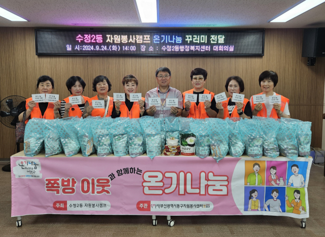 부산 동구(구청장 김진홍) 수정2동 자원봉사캠프(캠프장 이은수)는 지난 24일 취약계층 40세대를 방문해 식료품 꾸러미를 전달했다.