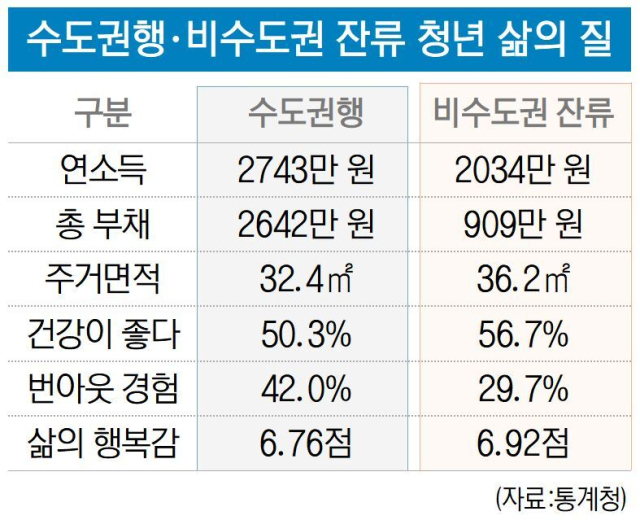 지방에서 수도권으로 옮긴 청년들의 연소득은 약간 늘었지만 총부채가 크게 증가했고 삶의 행복감도 많이 떨어진 것으로 나타났다. 직장·취업 준비 등으로 ‘번아웃(정신적 녹초상태)’을 경험한 비율도 비수도권에 그대로 남은 청년보다 크게 높아졌다.