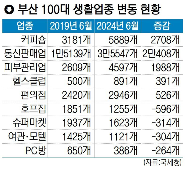 26일 국세통계에 나온 부산의 100대 생활업종을 2024년 6월과 코로나19 이전인 2019년 6월을 비교한 결과, 자영업자가 주로 운영하는 이들 업종은 5년간 많은 변화를 나타냈다. 100대 생활업종은 국세청이 사업자등록을 토대로 매월 발표하는 통계다.