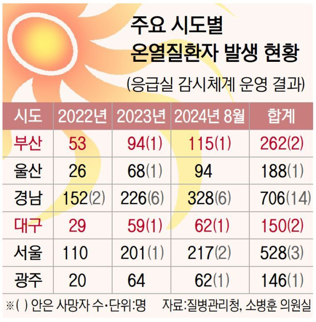 26일 더불어민주당 소병훈 의원(경기 광주갑)이 질병관리청으로부터 제출받은 온열질환자 발생 현황에 따르면 지난달까지 발생한 부산의 온열질환자 수는 115명으로 대구의 62명의 약 2배에 달했다. 온열질환으로 인한 사망자는 부산과 대구 각각 1명씩이었다. 이런 경향은 최근 수년간 이어졌다. 2022년과 2023년에도 부산의 온열질환자 수가 대구보다 1.5배에서 2배가량 많았다.