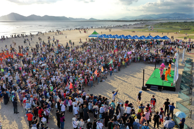 부산 바닷가 맨발걷기 축제인 ‘세븐비치 어싱 챌린지’ 다대포해수욕장 편이 진행된 28일 오후 많은 참가자들이 식전공연으로 가수 백프로의 공연을 즐기고 있다. 정종회 기자 jjh@