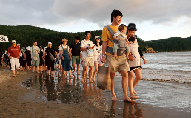 이날 다대포 하늘을 수놓은 황금빛 석양은 참가자들을 홀릴 정도로 아름다웠다. 너나 할 것 없이 저녁 노을을 배경으로 사진을 남기면서 바다는 거대한 포토 존이 됐다. 하진(9), 하준(4) 군과 현지(6) 양까지 세 자녀와 함께한 류동화(39), 임경화(39) 씨 부부는 “아이들이 해변에서 놀면서 정말 즐거워했다. 다대포 바다를 배경으로 멋진 사진도 많이 건졌다”고 웃었다. 이날 맨발로 걸은 최연소 참가자는 생후 29개월의 김주원 군이었다. 주원 군의 아빠 김지영(41) 씨는 누나의 추천으로 아내 손민경(38) 씨와 함께 다대포를 찾았다.
