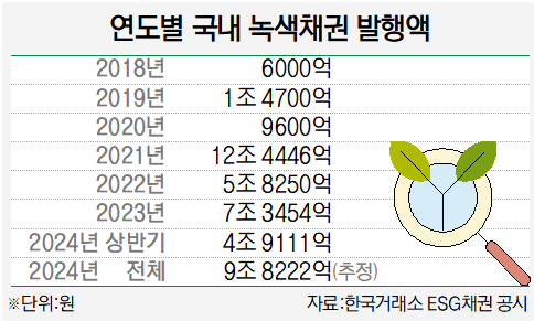 한국거래소에 등록된 첫 녹색채권은 2018년 산업은행이 발행했다. 태양광 발전과 복선전철 선로 설치 등에 쓰였고, 발행액은 3000억 원이었다. 이후 녹색채권 발행액은 편차가 있지만 꾸준히 늘어, 올해 상반기 누적 발행액이 33조 원을 넘어섰다.