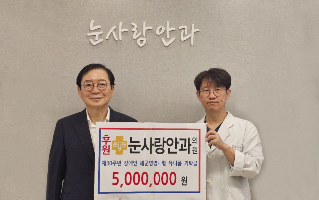 전웅찬 눈사랑안과의원 원장은 지난달 30일 부산 서면 눈사랑안과의원에서 장애청년과 비장애인이 함께하는 ‘제30주년 통일염원 및 충무공이순신장군 정신계승 해군병영체험대회’ 참가 대원 유니폼 비용 500만 원을 (사)부산국제장애인협의회(회장 강충걸)에 기탁했다.