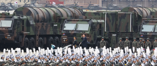 윤석열 대통령이 1일 경기도 성남 서울공항에서 열린 건군 76주년 국군의날 기념식에서 이날 최초로 공개된 ‘현무-5’를 사열하고 있다. 파괴력이 강력해 ‘괴물 미사일’로 불리는 '현무-5'는 북한 지휘부가 은신한 지하 벙커를 파괴할 수 있는 미사일로 알려졌다. 연합뉴스