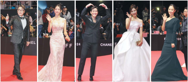 2일 부산 해운대구 영화의전당에서 열린 제29회 부산국제영화제(BIFF) 개막식에서 배우들이 레드카펫을 밟고 있다. 배우 조진웅, 공승연, 이정재, 김규리, 권유리(왼쪽부터). 정종회·김종진 기자 jjh@