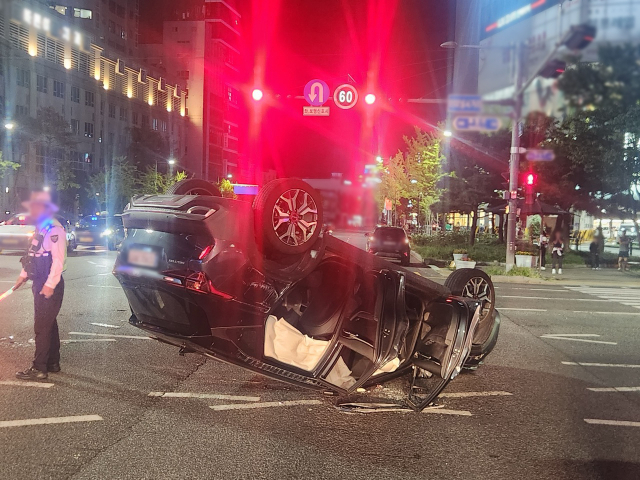 울산 남구 삼산동에서 음주운전 차량과 충돌해 승용차 한 대가 뒤집어져 있다. 울산경찰청 제공