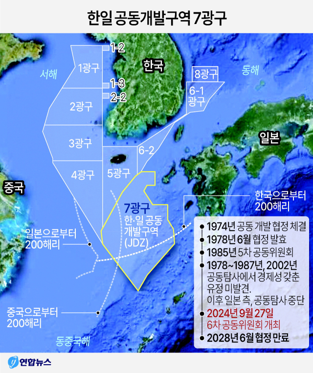 일본의 소극적 태도 전환에는 국제해양법 변화에 따른 얄팍한 계산이 깔려 있다는 분석이다. 1982년 유엔해양법협약으로 배타적경제수역(EEZ) 개념이 도입돼 일본에 우호적 국면으로 바뀐 것이다. 대륙붕 연장이 아니라 육지 기준 200해리 EEZ를 인정하면 일본에 유리해진다. 한국과 일본은 EEZ가 중첩될 수밖에 없는데 ‘등거리 원칙’에 따라 중간선을 설정하면 7광구 90%가 일본 수역에 쏠린다.