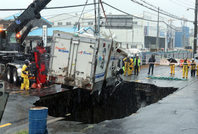 부산 지역에 200㎜ 이상의 폭우가 내린 지난달 21일 오전 부산 사상구 한 도로에서 가로 10m, 세로 5m, 깊이 8m가량의 대형 싱크홀이 발생해 트럭 2대가 빠지는 사고가 발생했다. 이날 오후 사고 현장 관계자들이 폭우가 내리는 속에 싱크홀에 빠진 차량을 크레인으로 끌어내고 있다. 정종회 기자 jjh@
