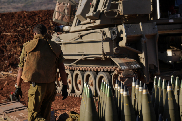 2일(현지시간) 레바논 국경 근처 이스라엘 포병 진지에서 이스라엘 군인이 포탄 앞을 지나가고 있다. 신화연합뉴스