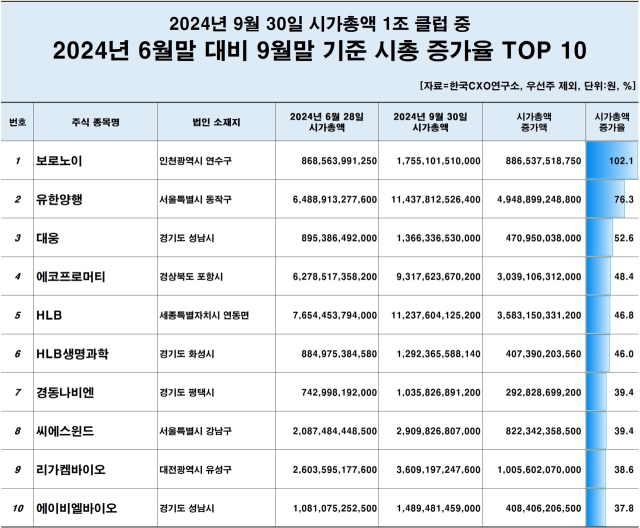 기업분석전문 한국CXO연구소는 7일 이 같은 내용을 골자로 한 ‘2024년 6월 말 대비 9월 말 기준 3분기 국내 주식시장 시가총액 변동 현황 분석’ 결과를 발표했다. 조사 대상 주식종목은 우선주를 제외한 2720곳이고, 올해 6월 28일과 9월 30일 종가 기준 시총과 순위 등을 비교해 살펴봤다.