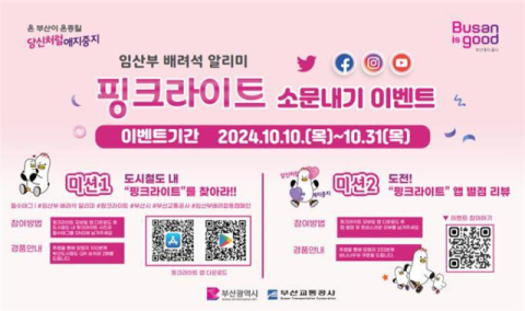 부산시(시장 박형준)는 부산교통공사와 함께 오는 10일부터 31일까지 제19회 임산부의 날(10.10.)을 맞이해 임산부 배려석 알리미 '핑크라이트' 앱을 연계한 '핑크라이트 소문내기 이벤트'를 진행한다고 밝혔다.