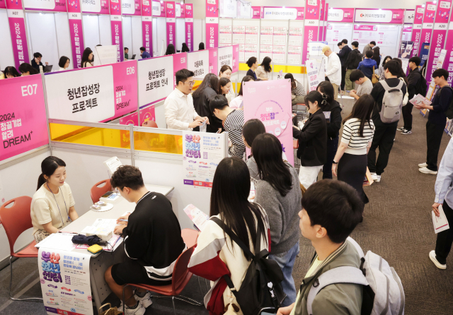 ‘부산 청끌(청년이 끌리는) 기업 알려 드림+’ 행사가 열린 8일 부산 벡스코 컨벤션홀이 청년 구직자로 붐비고 있다. 청끌 기업 24개 사를 비롯해 지역 중견기업 6개 사가 참여했다.