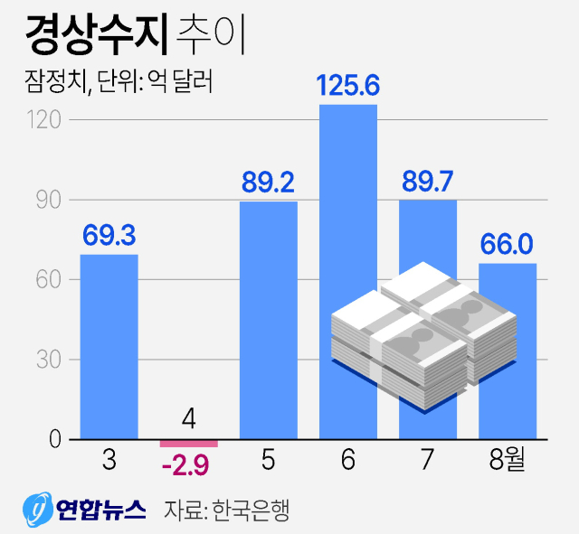 한국은행이 8일 발표한 국제수지 잠정통계에 따르면 지난 8월 경상수지는 66억 달러(약 8조 8900억 원) 흑자로 집계됐다. 앞서 4월 외국인 배당 증가 등으로 1년 만에 적자(-2억 9000만 달러)를 기록했다가 5월(89억 2000만 달러) 반등한 뒤 6월(125억 6000만 달러), 7월(89억 7000만 달러)에 이어 4개월 연속 흑자다.