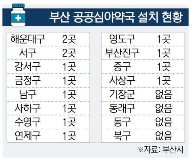 9일 기준 부산에는 지자체 12곳에 공공심야약국 14개이 운영되고 있다. 서구와 해운대구에 각각 2개씩 있고, 강서구·금정구를 포함한 10개 지자체에 1곳씩 운영되고 있다. 공공심야약국이 없는 곳은 △북구 △동구 △동래구 △기장군 등 4곳이다.