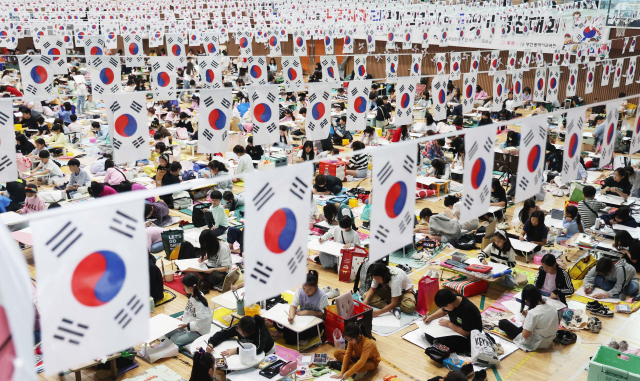 한글날을 맞아 9일 오후 부산 연제구 부산교육대학교 제1체육관에서 제13회 나라사랑 태극기 그리기 및 글짓기 경진대회가 열렸다. 바른교육실천을 위한 부산학부모모임 주최로 열린 이번 행사에는 부산 지역 초등학생 900여 명이 참가했다. 이재찬 기자 chan@