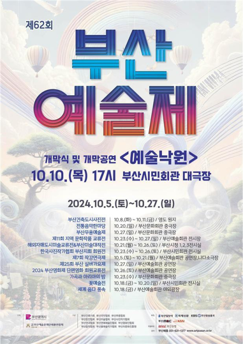 부산시(시장 박형준)와 (사)부산예술문화단체총연합회(이하 부산예총)는 10일 오후 5시 부산시민회관 대극장에서 부산 유일의 종합예술 축제인 「제62회 부산예술제」 개막식을 개최한다고 밝혔다.