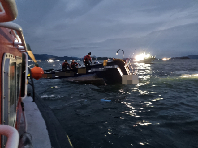창원해양경찰서 경찰관들이 지난 1일 오후 6시께 진해구 잠도 앞바다에서 침몰하고 있는 4t급 낚시어선 배수 작업을 하고 있다. 창원해양경찰 제공