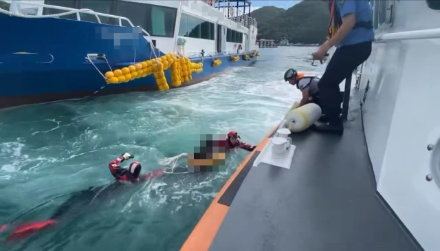 통영해양경찰관들이 거제시 남부면 근포항에서 물에 빠진 낚시객을 구조하는 모습(기사 내용과 관련 없음). 통영해양경찰서 제공