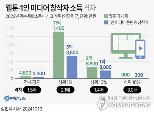 상위 10%와 하위 10%의 소득격차는 1인 미디어 창작자가 63배로, 웹툰작가(30배)의 두배에 달했다.
