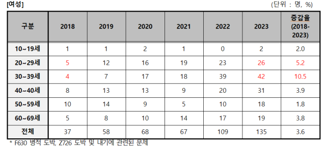 2023년 기준 2030세대 도박 중독 환자 수는 남성이 1889명으로 여성(68명)보다 27.8배나 많았다. 하지만 2030세대 여성 도박 중독 환자는 2019년 9명에서 2023년 68명으로 5년 새 7.6배 급증했다. 같은 기간 2030세대 남성 도박 중독 환자 수 증가율(827명→1889명, 2.3배) 보다 여성이 3.3배나 높은 셈이다.