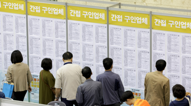 14일 부산 연제구국민체육센터에서 열린 ‘연제구 일자리 박람회’에서 참가자들이 채용기업 현황판을 살펴보고 있다. 이번 일자리 박람회는 지역업체의 인력난을 해소하고, 청년·중장년·노인·여성 등 다양한 분야의 일자리 정보를 구직자에게 제공해 지역 주민의 고용률을 높이기 위해 마련됐다.