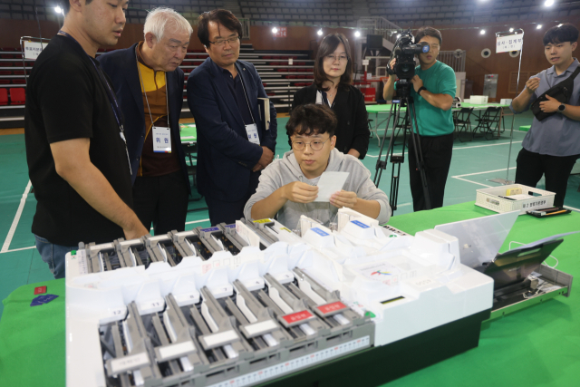 15일 부산 금정구 스포원파크 실내체육관에서 금정구선거관리위원회 직원과 선거관리위원들이 개표소 점검을 하고 있다. 이재찬 기자 chan@
