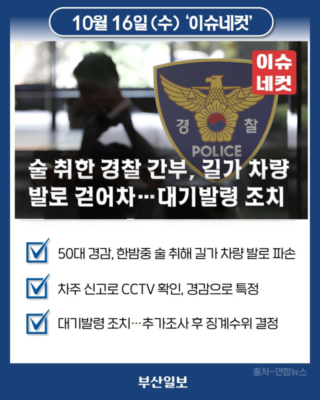 현직 경찰 간부가 술에 취한 상태로 길가에 주차된 차량을 발로 가격해 파손한 사실이 드러나 대기발령 조치를 받았습니다.