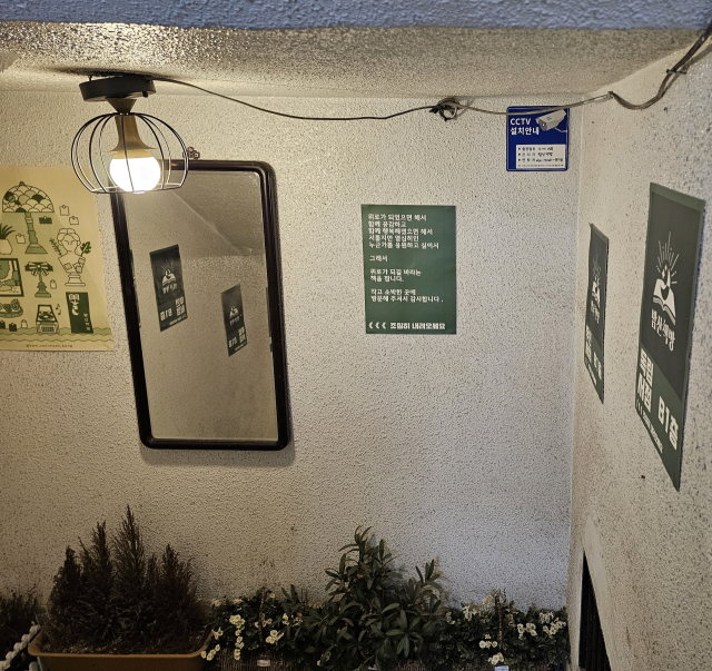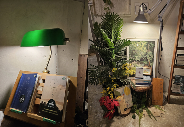 독특하게 꾸민 입구 덕에 자연스레 눈길이 가는 밤산책방은 “낮, 밤 언제든 시간 제약 없이 쉬어 가는 위로 서점”을 표방한다. 지하 1층으로 향하는 계단에는 “위로가 되었으면 해서, 함께 공감하고 함께 행복해졌으면 해서, 서툴지만 열심인 누군가를 응원하고 싶어서 위로가 되길 바라는 책을 판다”는 안내 문구가 방문객을 반긴다. 녹색 바탕에 하얀색 글자가 적힌 포스터가 학창 시절 칠판을 연상시킨다. 따뜻한 백열등 아래 놓인 소박한 화분들조차 제법 편안한 분위기를 만들고 있다.