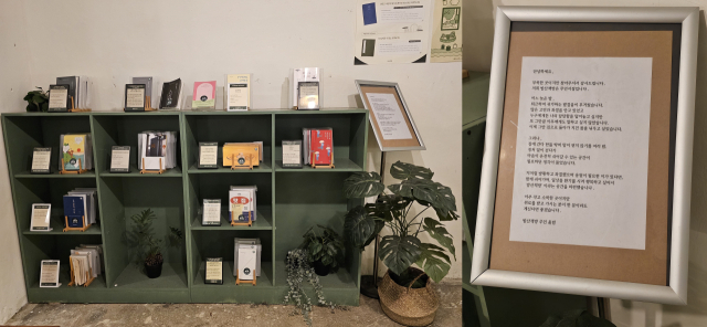 책방 입구 근처에 놓인 책장. 책장 오른쪽에는 김소라 대표가 방문객에게 쓴 편지가 있다. 조경건 부산닷컴 기자