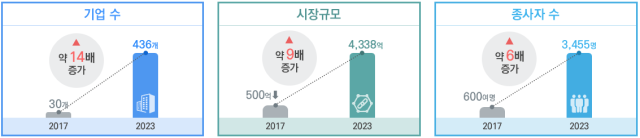 국회 과학기술정보통신위원회 소속 국민의힘 최수진 의원이 17일 과학기술정보통신부로부터 제출받은 ‘블록체인 산업 진흥을 위한 제도 개선방안 연구’와 ‘블록체인 전문인력 현황조사 및 양성방안 연구’ 등 자료에 따르면, 최근 5년(2017~2023년)간 국내 블록체인 기업 수는 30개에서 436개로 약 14배, 시장 규모는 500억 원에서 4338억 원으로 약 9배 급증했다. 같은 기간 관련 종사자 수도 600여 명에서 3455명으로 약 6배 늘었다.