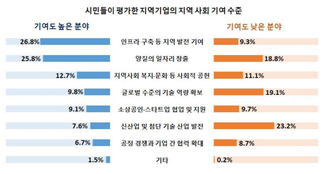 지역 기업의 지역 사회 기여도가 가장 높은 분야로 꼽힌 것은 ‘인프라 구축 등 지역 발전 기여’(26.8%)였다. 양질의 일자리 창출(25.8%)과 지역사회 복지 등 사회적 공헌(12.7%) 등이 뒤를 이었다. 반면 ‘신산업 및 첨단기술 산업 발전’(23.2%)은 기여도가 가장 낮은 분야로 꼽혔다.