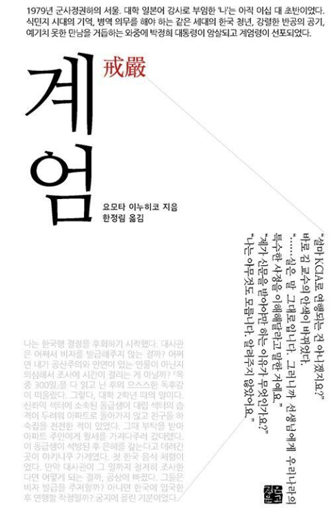 1979년 서울 한 대학에 일본 청년이 일본어 강사로 부임하며 이야기가 시작된다. 그가 서울에 온 지 얼마 지나지 않아 박정희 대통령이 암살되고 계엄령이 선포된다. 1년간의 서울 체류는 이처럼 예상치 못한 만남의 연속이었다. 저자가 직접 겪은 실화가 바탕이 된 소설이다. 김영삼, 김대중 등 실존 인물들이 등장해 더욱 박진감이 넘친다. 요모타 이누히코 지음/한정림 옮김/정은문고/304쪽/2만 1000원.