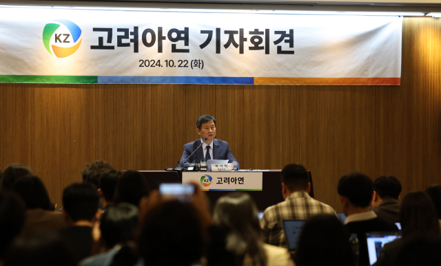 22일 오전 서울 한 호텔에서 박기덕 고려아연 사장이 자사주 공개 매수 종결을 하루 앞두고 연 기자회견에서 발언하고 있다. 연합뉴스