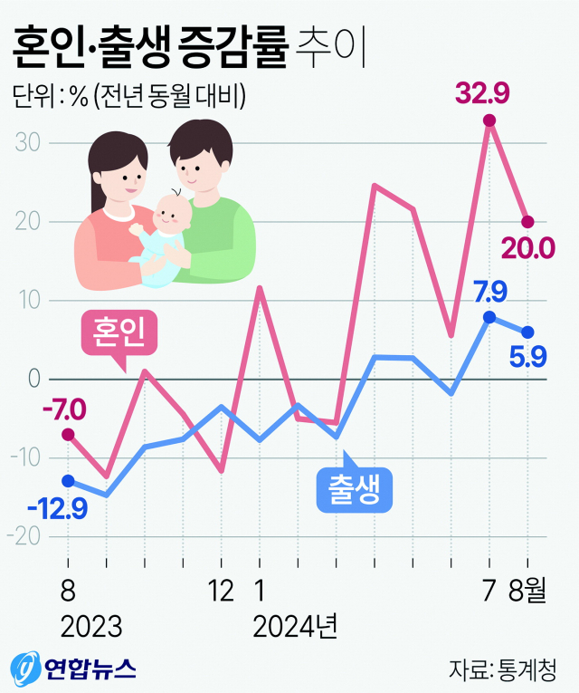 통계청이 23일 발표한 ‘인구 동향’에 따르면 올해 8월 전국 출생아 수는 2만 98명으로 1년 전보다 1124명(5.9%) 증가했다. 8월 기준으로 보면 2021년에 2095명 늘어난 이후 12년 만에 가장 큰 폭의 증가세다.
