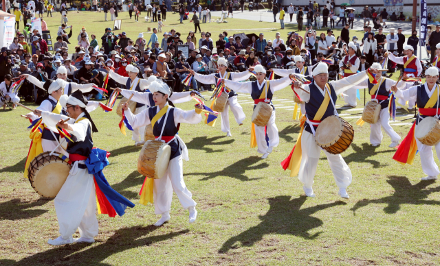 동래지신밟기와 다대포후리소리 등 부산의 무형유산과 전통 놀이를 체험할 수 있는 ‘2024 부산민속예술제’가 지난 26일과 27일 이틀간 열렸다. 부산 부산진구 부산시민공원 다솜광장에서 지난 26일 진도 북놀이 공연이 신명나게 펼쳐지고 있다. 정종회 기자 jjh@