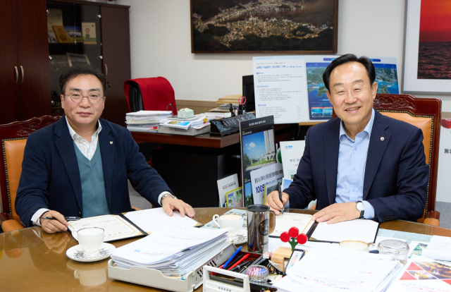 통영시지속가능발전교육재단(통영RCE)과 경상국립대학교 해양과학대학은 29일 통영시청에서 공존의 가치를 실현하는 환경·교육도시 구현을 위한 업무협약을 체결했다. 대학 이정석 학장(왼쪽)과 재단 천영기 이사장이 협약서에 서명하고 있다. 통영시 제공
