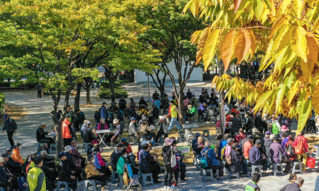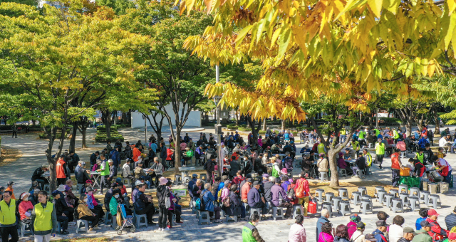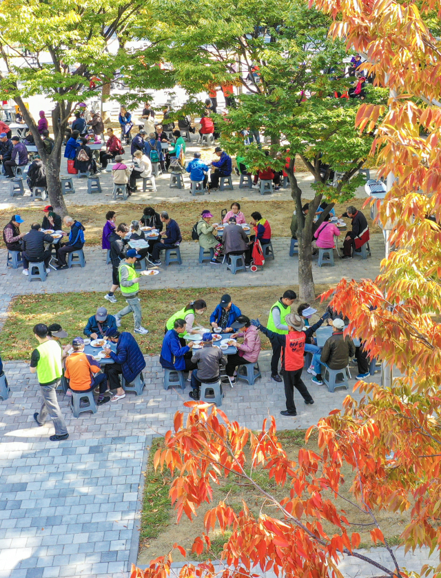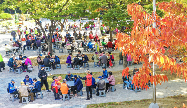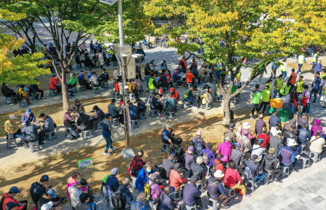 한국노총 부산본부와 부산밥퍼나눔공동체 관계자, 자원봉사자 등이 30일 부산 연제구 부산시청 녹음광장에서 취약계층 어르신 500여 명에게 무료 식사를 대접하고 있다. 김종진 기자 kjj1761@