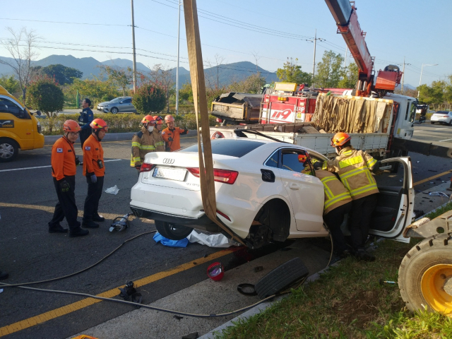30일 오후 3시 20분께 부산 강서구 대저1동 한 도로에서 70대 A 씨가 몰던 승용차가 나무 식재 작업을 위해 3차로에 정차 중이던 5t짜리 트럭을 들이받고 작업자와 신호수 2명을 잇따라 덮쳤다. 부산소방재난본부 제공