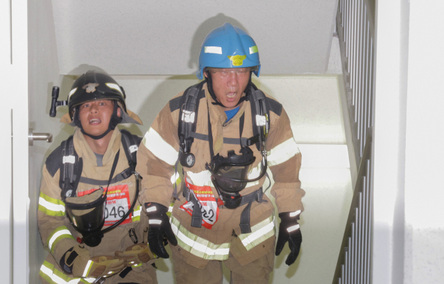 30일 부산 해운대구 엘시티(LCT)에서 열린 전국 소방공무원 계단 오르기 대회에서 소방대원들이 20kg 상당의 화재 진압 장비를 착용하고 100층 계단을 올라가고 있다.