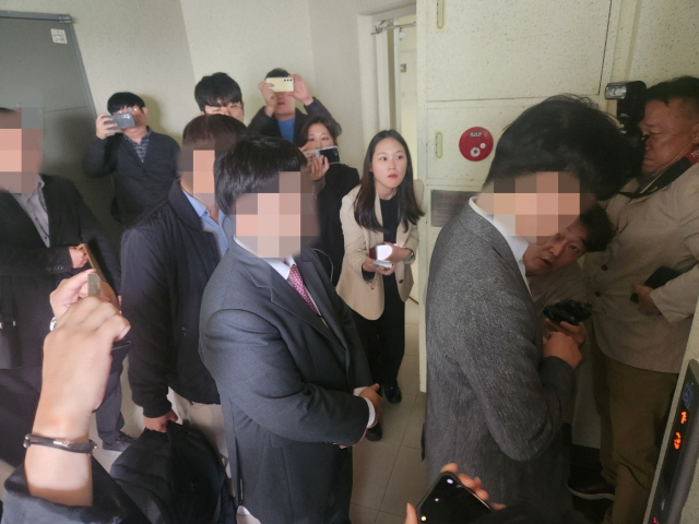 31일 오후 창원지검 관계자들이 명태균 씨 자택 압수수색을 마친 뒤 명 씨 거주 아파트 엘리베이터를 기다리는 모습. 강대한 기자